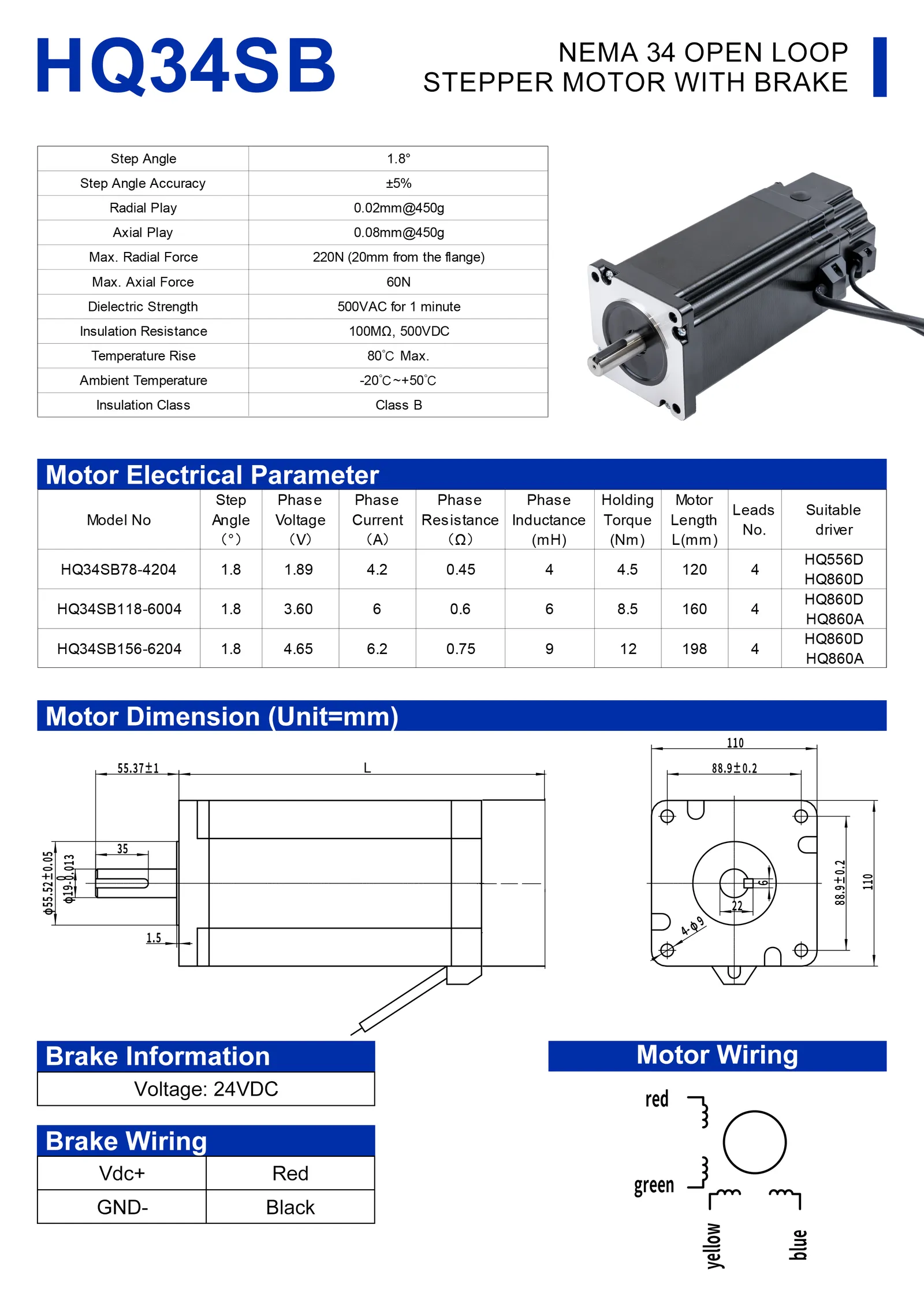 | HQ34SB78-4204 | 4.5 Nm | 4.2 A | 120 mm | HQ556D/HQ860D |