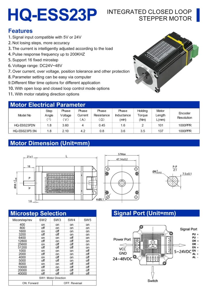 HQ-JSS34P serisi, NEMA 34 (86mm) gövde üzerinde sürücüsü ve enkoderi tümleşik olarak gelen kompakt bir çözümdür. 1000 PPR yüksek çözünürlüklü enkoderi sayesinde pozisyonu sürekli denetler. Harici bir sürücüye ihtiyaç duymaz, doğrudan 24-80VDC besleme ve Pulse/Yön sinyalleri ile çalışır.